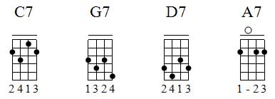 Para encontrarmos os acordes no braço do cavaco com mais facilidade vamos utilizar 3 modelos de acorde que serão: D7, F7 e A7.