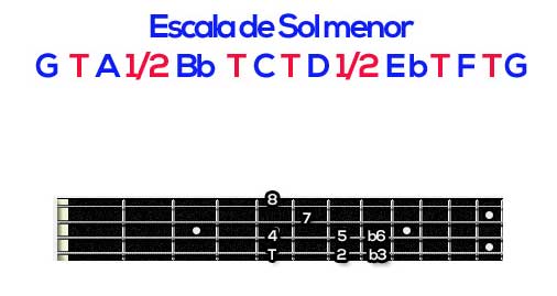 Tocando no instrumento a escala de Gm e os seus intervalos teremos: