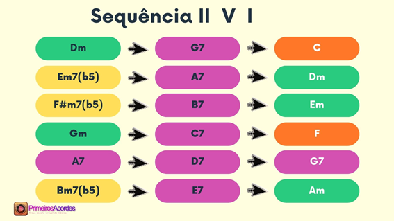 Veja que se eu usasse apenas os acordes do campo harmônico, minha harmonia seria bem limitada, mas se eu aplico a regra do 2 5 1, para cada acorde do campo harmônico, as minhas possibilidades se ampliam.