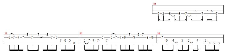 Durante o solo da guitarra, uso no contrabaixo as pentatônicas de Em e Am, para ligar os acordes, bem ao estilo do Roger Glover (Deep Purple).