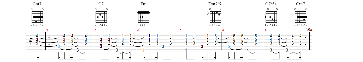 Cm7 | C7 | Fm | % | Dm7(b5) | G7(#5) |