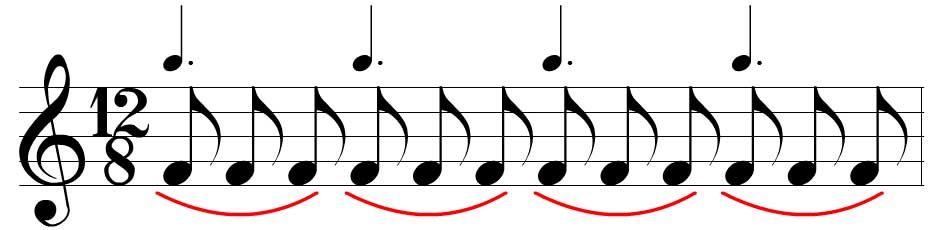 - Observe que as seis colcheias podem ser agrupadas tanto em dois tempos (binário composto) quanto em três tempos (ternário simples).