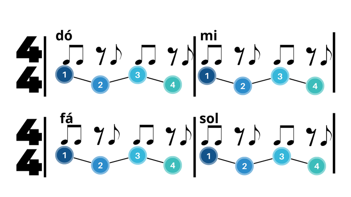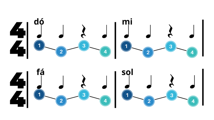 E seguimos com a semínima. Toque ou dê a pausa nos tempos 1, 2, 3 e 4. Deixe a nota ou o silêncio soar por 1 tempo.