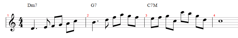 Agora, utilizando a sequência de acordes, vou utilizar algumas notas guias e criar um solo sobre esses acordes, nos acordes de Dm7(b5) e G7, escala menor harmônica, e no acorde de Cm, a escala menor natural: