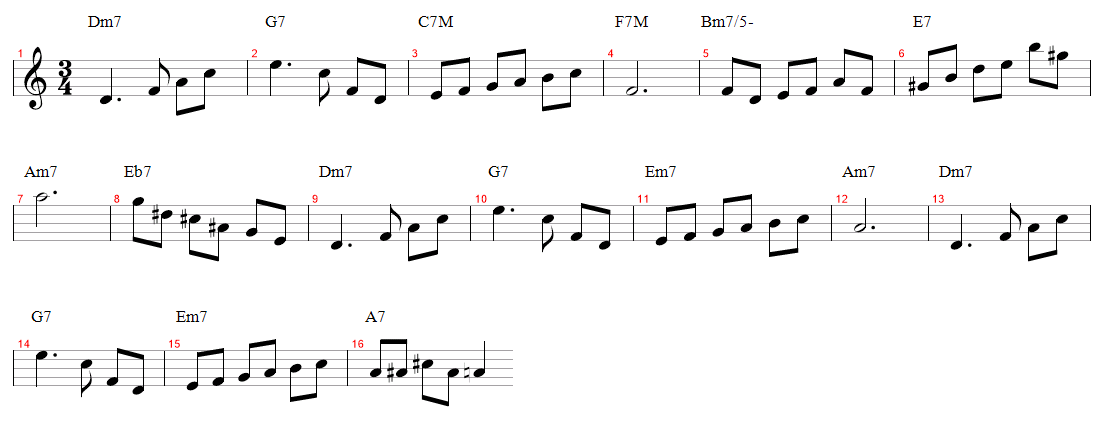 Recomendo também os Songbooks ou Real Books escritos em clave de fá. Vamos utilizar o mesmo tema, agora na clave de fá: